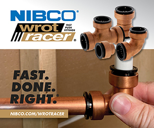| | Advertisement | NIBCO® Wrot Racer® copper push fittings simply slide into place for a fast, secure connection. They transition easily between piping systems connecting PEX, PE-RT, CPVC or copper tubing – no soldering, crimping or joining materials needed. |