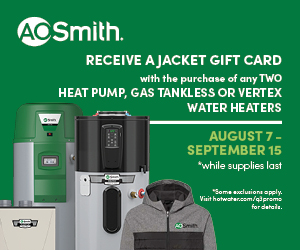 | | Advertisement | Now through September 25th, contractors receive a jacket gift card with the purchase of any two Heat Pump, Gas Tankless or Vertex water heaters at participating wholesale locations.* Find a wholesaler near you at hotwater.com/q3promo. |