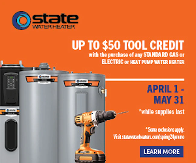 | | Sponsored | | Now through May 31st, contractors receive up to $50 in tool credit with the purchase of any standard gas, electric or heat pump water heaters at participating wholesale locations.* Find a wholesaler near you at statewaterheaters.com/spring24promo. |