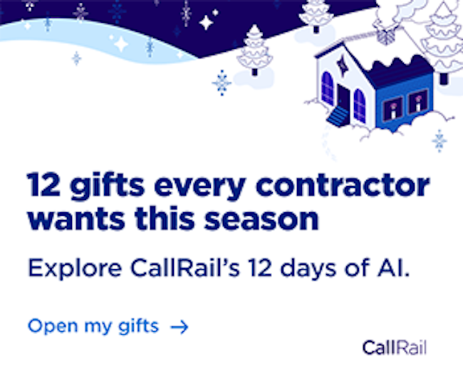 | | Sponsored | It's the holiday season, and CallRail is here with 12 Days of AI, a festive showcase of how smart AI tools are powering real results for contractors like you. See 12 AI outcomes that businesses are celebrating, from faster lead qualification to smarter follow-ups, better call insights, and more booked jobs. |