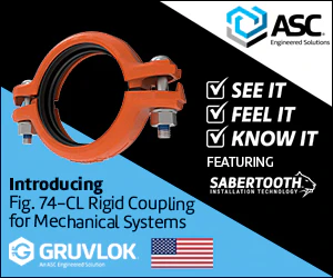 | | Sponsored | Two patent-pending Gruvlok® rigid couplings from ASC Engineered Solutions are now available that will revolutionize mechanical piping system installations. The new Fig. 74-CL and Fig. 74-SL rigid couplings feature brand new Sabertooth™ Installation Technology, allowing for quick and accurate visual and tactile installation verification. See it, feel it, know it. |